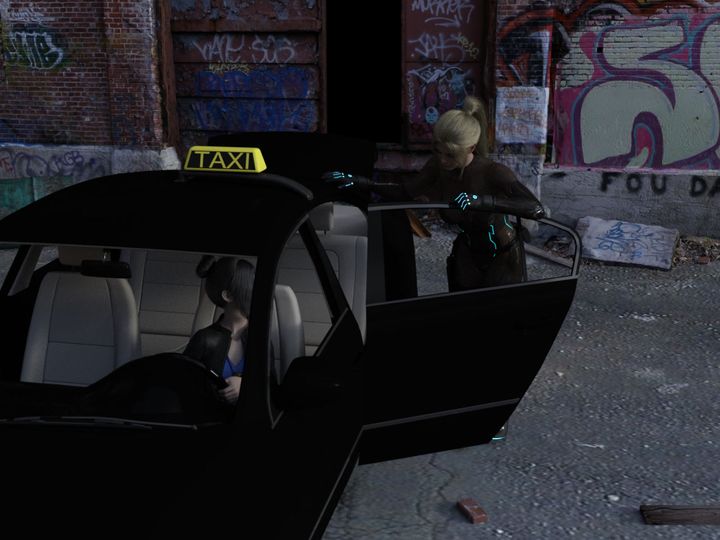 “老样子,走屋顶。”谈话间 Tess 已经下了车,她向高处射出一道绳索,固定好以后转头对小 A 说: