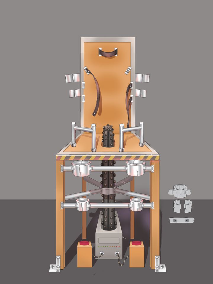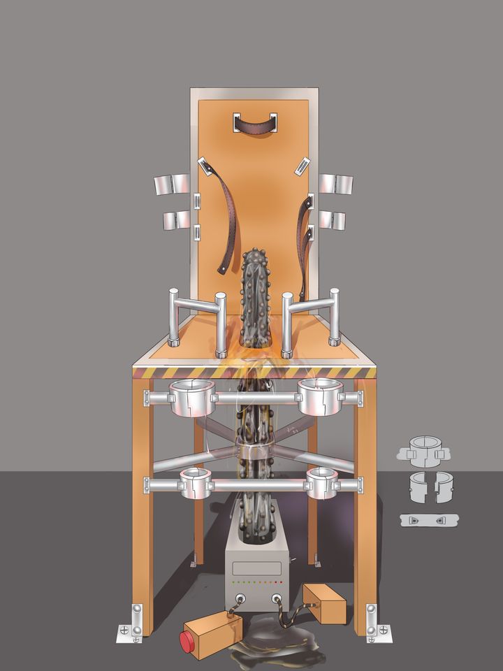 拘束椅是用木头制成的,在椅子腿,椅背侧面有数个用于固定四肢的金属铐环。椅背正面则有用于拘束身体和脖子的皮带。椅面上还有两个用来压腿的金属固定器。拘束椅面前的地上摆着两个连着线的木头块,木头块顶部各有一个红色按钮。除此之外,最让我担心的则是椅面上的两个洞。椅子底下有一个金属机器。机器顶部伸出了两根银黑色的金属棒,从椅子底座上伸出。金属棒很粗,且侧面有许多凸起。我猜测,那两根金属棒是要插入我的阴道和肛门的。而椅子下的金属机器,则是驱动金属棒的炮机。